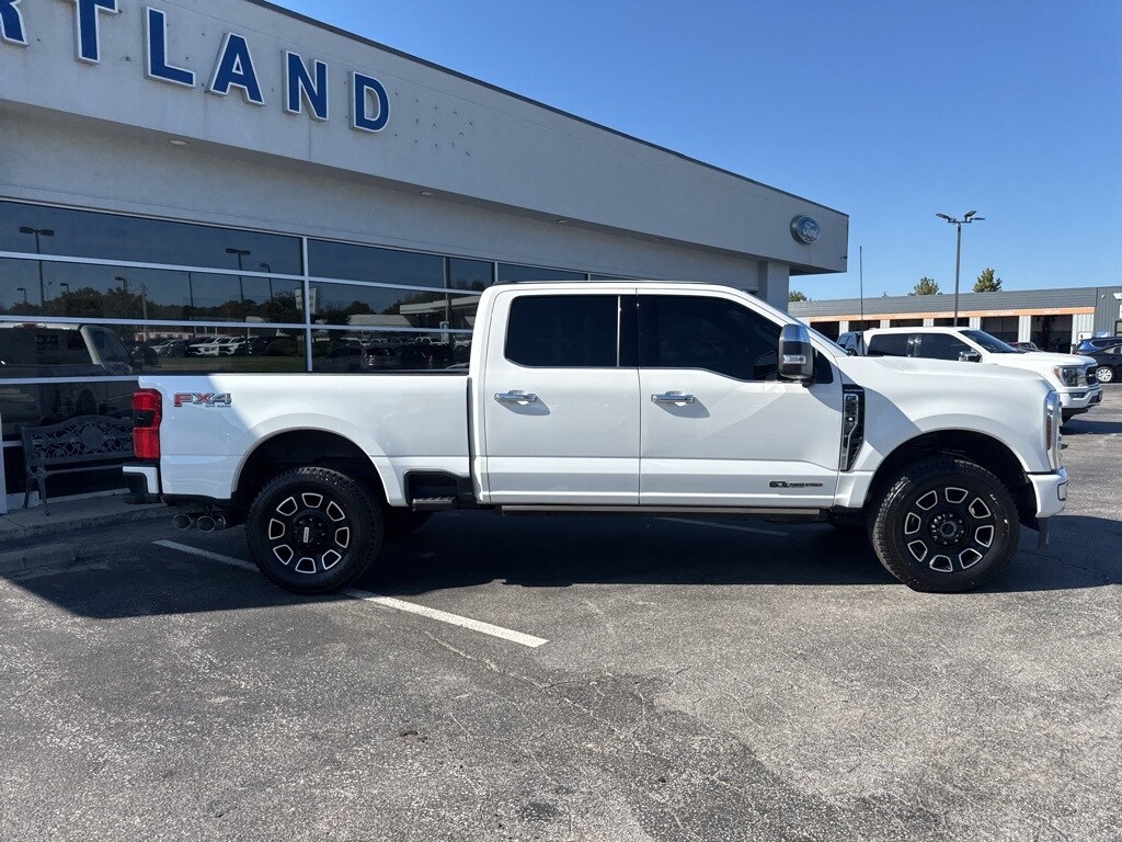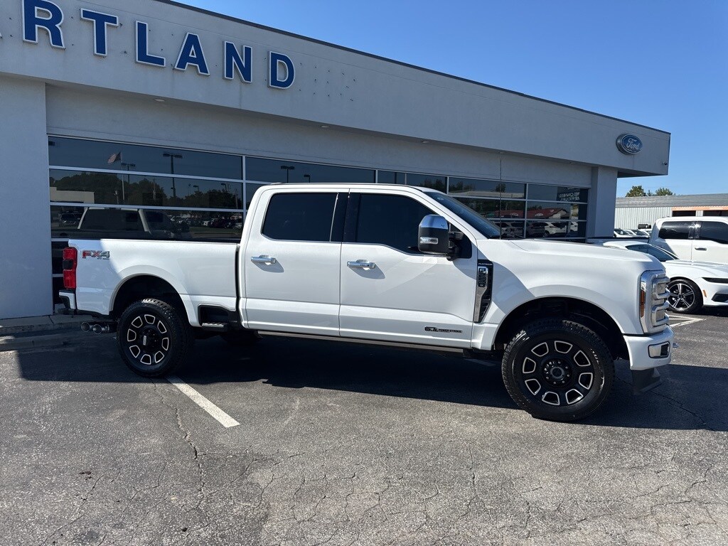 This 2024 Ford F-250SD Platinum in White comes with the following features: Power Stroke 6.7L V8 DI 32V OHV Turbodiesel 10-Speed Automatic 4WD F-250 >10K GVWR Package, 4WD, 3.73 Axle Ratio, 4-Wheel Disc Brakes, ABS brakes, Adjustable pedals, Air Conditioning, Alloy wheels, AM/FM radio: SiriusXM with 360L, Auto High-beam Headlights, Auto tilt-away steering wheel, Auto-dimming Rear-View mirror, Automatic temperature control, Brake assist, Compass, Delay-off headlights, Driver door bin, Driver vanity mirror, Dual front impact airbags, Dual front side impact airbags, Electronic Stability Control, Emergency communication system: SYNC 4 911 Assist, Exterior Parking Camera Rear, Flow-Through Console, Front anti-roll bar, Front Bucket Seats, Front Center Armrest, Front dual zone A/C, Front fog lights, Front reading lights, Fully automatic headlights, Garage door transmitter, Heated door mirrors, Heated front seats, Heated rear seats, Heated steering wheel, Illuminated entry, Leather steering wheel, Low tire pressure warning, Memory seat, Navigation system: Connected Navigation (includes complimentary 1-year trial), Outside temperature display, Overhead airbag, Overhead console, Panic alarm, Passenger door bin, Passenger vanity mirror, Pedal memory, Power door mirrors, Power driver seat, Power passenger seat, Power steering, Power windows, Radio: B&O Unleashed Sound System by Bang & Olufsen, Rain sensing wipers, Rear reading lights, Rear seat center armrest, Rear step bumper, Rear window defroster, Remote keyless entry, Security system, SiriusXM Radio w/360L, Speed control, Split folding rear seat, Steering wheel memory, Steering wheel mounted audio controls, SYNC 4 w/Enhanced Voice Recognition, Tachometer, Telescoping steering wheel, Tilt steering wheel, Traction control, Trip computer, Turn signal indicator mirrors, Variably intermittent wipers, and Ventilated front seats. 4WD.